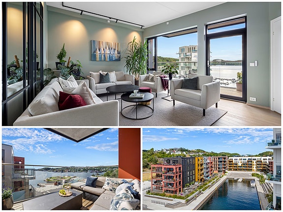Bryggebyen - Gjennomgående toppleilighet mot vest - 2 balkonger - Garasjeplass - Panoramautsikt, morgen- og kveldssol