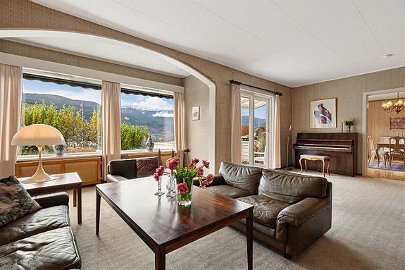 Eiendommen utstråler sjarm og karakter med klassiske linjer, høye tak og store vindusflater.