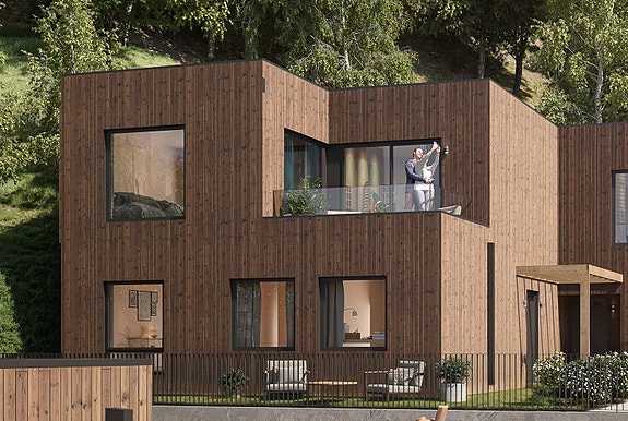 Boligen får panel i tre med en fargepalett som er samstemt omgivelsene og taket blir sedumdekket.