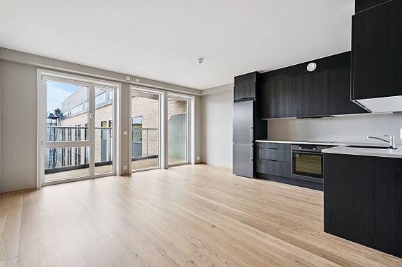 Leiligheten holder en moderne og tidsriktig standard med lyse flater, parkett på gulv og vannbåren gulvvarme. Kjøkkenet har integrerte hvitevarer og god skapplass, mens badet fremstår stilrent og delikat med fliser på gulv og vegg. Boligen har balansert ventilasjon som gir et behagelig inneklima, og det er gjenværende nybygggaranti fra utbygger.