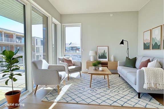 En moderne og frittliggende 3-roms toppleilighet med store vindusflater, lekkert Sigdal-kjøkken, vannbåren varme, flislagt bad og eget vaskerom. Fra stuen har du direkte utgang til en romslig balkong med utsikt mot de grønne fellesarealene. Dette er et funksjonelt og innbydende hjem som gir deg både komfort og hverdagsglede med sjøbris, grønne omgivelser og kort vei til alt du trenger.