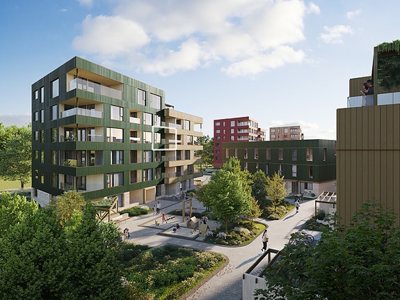 I blokken kommer det felles gjestehybel og felles takterrasse, i tillegg får man tilgang til felles selskapslokale i naboblokken.