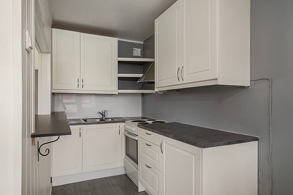 Leiligheten ligger i 1. etasje og fremstår med behov for oppgraderinger. Leiligheten har en praktisk planløsning med kjøkken i delvis åpen løsning mot stuen. I stuen er det plass til å lage sovalkove. Fra kjøkken er det utgang til innglasset balkong som slipper inn rikelig med dagslys og fungerer som et ekstra oppholdsrom store deler av året.