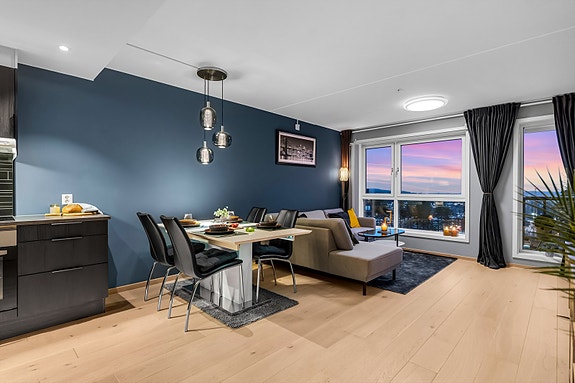 Lekker 2-roms frontleilighet m/​vestvendt balkong på 16m²! Fantastisk utsikt - Garasjeplass m/​lader - Populær beliggenhet