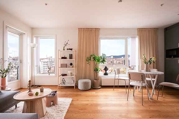 Moderne & luftig 3-R hjørneleilighet m/​ 11 kvm balkong i bygg fra 2020. Selveier, 8. etg m/​heis & akonto oppvarming