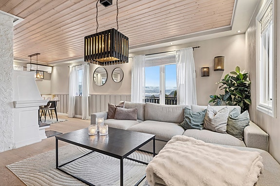 Stuen ligger i delvis åpen løsning med kjøkkenet. Et lyst og innbydende rom med store vindusflater som sørger for rikelig med naturlig lys.