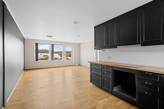 Stue/kjøkken med utgang til terrasse. Fotograf: Hanne Karlsen