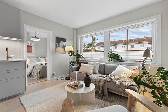 Delikat og lys 2-roms leilighet i høy 1. etasje (2. etasje fra bakkeplan). Store vindusflater gir gode lysforhold og hyggelig utsikt. Dette kombinert med den praktiske planløsningen sørger for en luftig atmosfære. Leiligheten har en attraktiv beliggenhet i populære Skauen Borettslag.