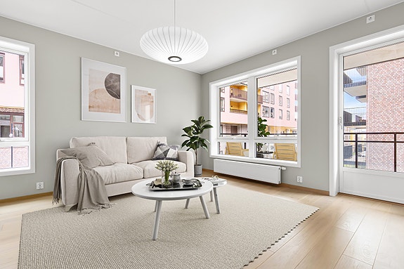 Nyoppført 3-roms hjørneleilighet med sydvestvendt balkong på 9 kvm - Heis - A konto fjernvarme inkl.