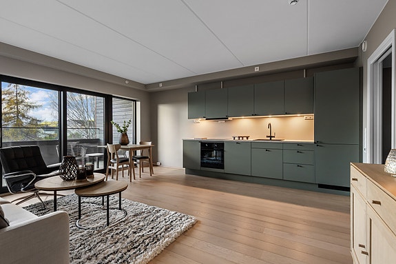 Innvendig fremstår boligen som lys og stilren, med smakfulle fargevalg og materialer av god kvalitet. Kjøkkenet er fra Sigdal og er utstyrt med integrerte hvitevarer. Leiligheten er utstyrt med balansert ventilasjonsanlegg og har et lekkert, flislagt bad med behagelig gulvvarme.