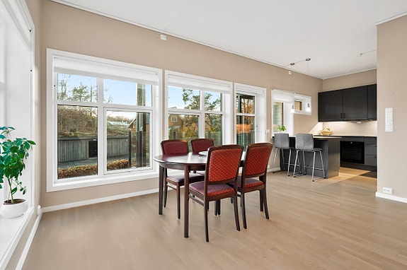 Lys og koselig stue med åpen kjøkkenløsning - store vinduer gir rikelig med dagslys.