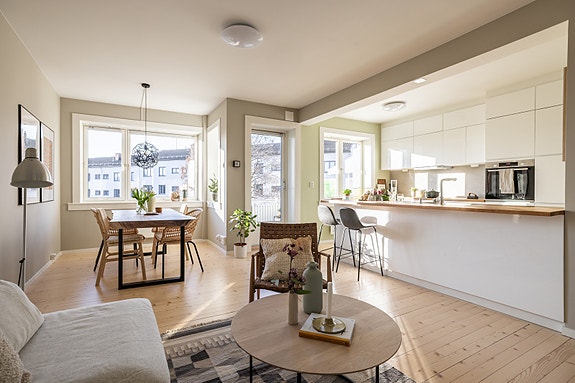 Det er noe med stemningen idet du kommer inn, luften, lyset, roen. Denne fine 3-R toppleilighet (4. etg.) er en sånn bolig: Full av dagslys, luft og lunhet. Planløsningen er smart og åpen, og de store vindusflatene (fra 2016) gir masse naturlig lys i tillegg til flott og fritt utsyn. Standarden er god med både kjøkken, elektrisk anlegg og overflater oppgradert i senere tid. Baderommet er fra 2008 i regi av borettslaget.