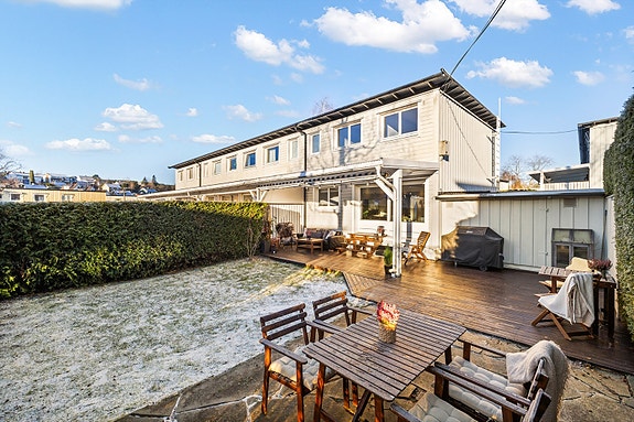 SJELDEN SJANSE | Delikat og velholdt enderekkehus o/tre plan| Skjermet, stor uteplass og hage | Garasje | Barnevennlig