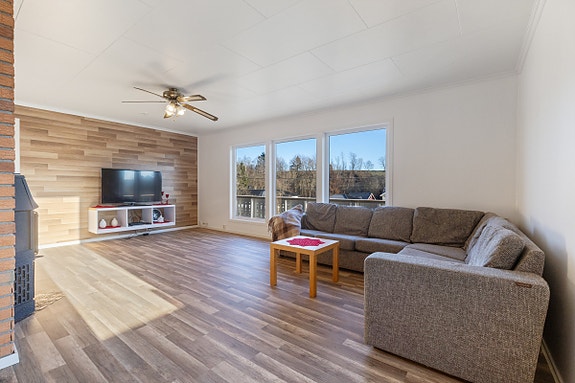 Boligen fra 1969 fordeler seg over to plan og har en praktisk planløsning med tre soverom i hovedetasjen. Her finner du også en romslig stue med vedovn, kjøkken og bad. Fra stuen er det utgang til en stor terrasse og balkong på til sammen 50 kvm, som gir rikelig med plass for utemøbler og hyggelige stunder. I sokkeletasjen er det en praktisk kjellerstue, også den med vedovn, samt garasje og gode lagringsmuligheter.