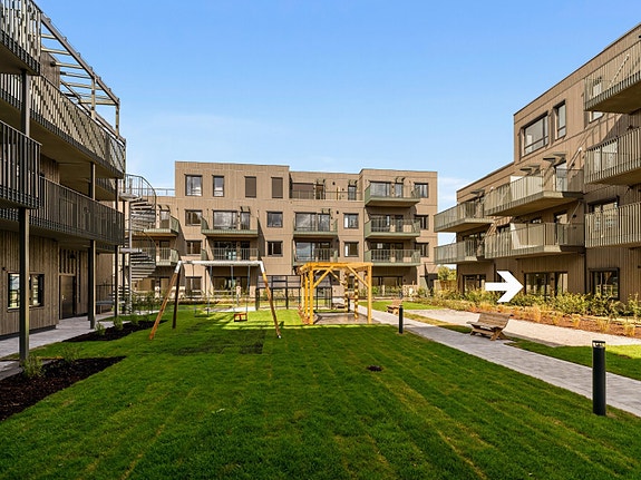 Nyoppført 3-roms selveier med 12 kvm balkong, garasje og heis. Adgang felles takterrasse, gjesteleilighet og gjestestue.