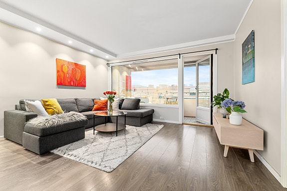 Pen 2-roms leilighet med store vindusflater, en romslig planløsning og oppgradert standard! Beliggende høyt oppe i femte etasje med flott utsikt over sameiets fellesområde/bakgård og nesten ingen direkte innsyn, oppleves leiligheten som usjenert. Fra stuen er det utgang til herlig balkong på hele 8 kvm. Her er det sol store deler av dagen, og markise som gjør at leiligheten holder seg behagelig sval gjennom varme sommerdager. En lys og arealeffektiv leilighet hvor bygården ligger i urbane omgivelser, men skjermet med umiddelbar nærhet til både parker og Barcode, samt alt Grønland og Tøyen har å by på! Beliggenheten anses som sjeldent god med alt av byens fasiliteter rett utenfor døren!