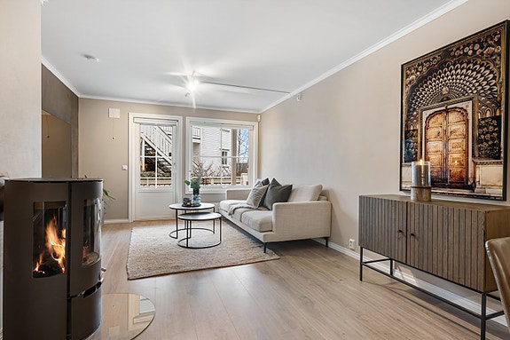 Flott halvpart av horisontaldelt tomannsbolig | Peisovn | Solrik terrasse | Carport | Markanært!