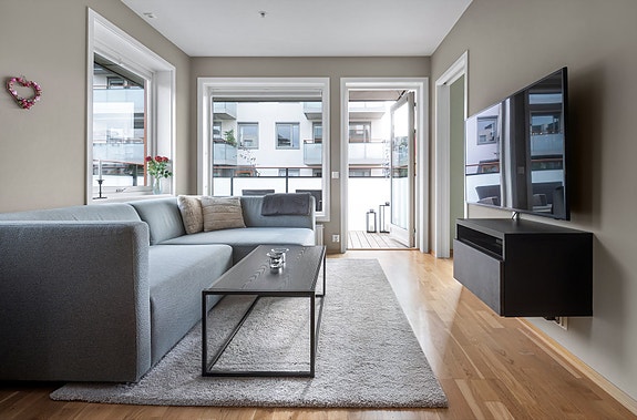 Lekker 3-roms hjørneleilighet fra 2016 | Med solrik balkong og moderne standard | Heis | Akonto varmtvann og fyring