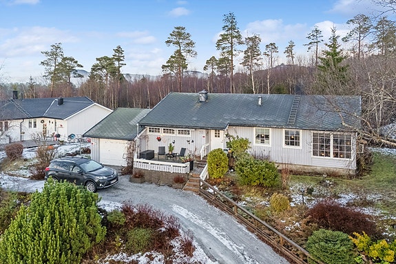Enebolig med alle bofunksjoner på 1 plan. 2 sov (mulighet for 3) I Enkel garasje I Utsikt I Gode solforhold.