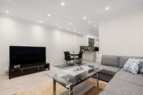 Leiligheten fremstår som moderne med en åpen stue- og kjøkkenløsning. Kjøkkenet fra HTH ble installert i 2020 og har integrerte hvitevarer. I 2025 ble badet rehabilitert i regi av borettslaget, og fremstår som delikat og tidsriktig. Fra stuen er det utgang til en sydvendt, solrik og innglasset balkong på 8 kvm, som forlenger stuen og gir et hyggelig uterom. Leiligheten disponerer også to kjellerboder for ekstra lagringsplass.
