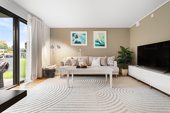 • Lys stue med åpen kjøkkenløsning og utgang til terrasse.