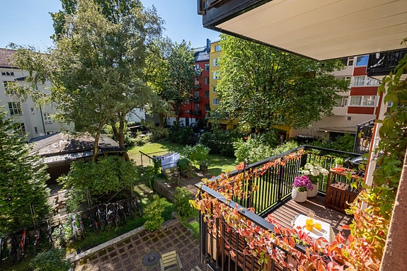 Boligen har egen, sydvestvendt balkong mot det rolige gårdsrommet.