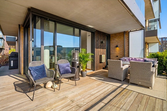 Nyere (2019) og moderne 3-roms hjørneleilighet -2 bad -Solrik markterrasse (29 kvm)-Gasspeis -Heis -Garasjeplass m/EL