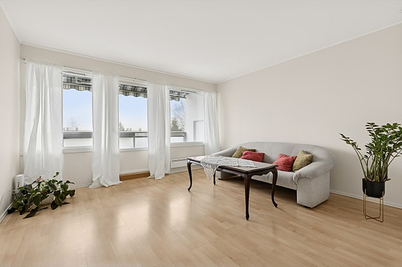 Boligen ligger i høy 1. etasje og har en smart og god planløsning. Du får en fin stue med utgang til en sydvendt balkong, hvor du kan nyte både sol og utsikt. Kjøkkenet er adskilt og praktisk innredet, og badet er romslig og har opplegg for vaskemaskin. Det er to soverom. Det er god plass til både seng og garderobeskap på begge rommene. I tillegg følger det med en innvendig bod som gir deg godt med oppbevaringsplass.