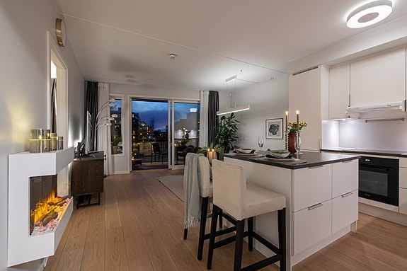 Entréen gir et ryddig førsteinntrykk med gode garderobeløsninger. Stuen er lys og luftig med store vindusflater og utgang til en sydvestvendt balkong. Kjøkkenet har moderne innredning med kjøkkenøy og integrerte hvitevarer fra Miele. Badet fremstår lekkert med vannbåren gulvvarme, delikate fliser og opplegg for vaskemaskin. Videre har leiligheten et romslig soverom med garderobeskap, samt en innvendig bod.