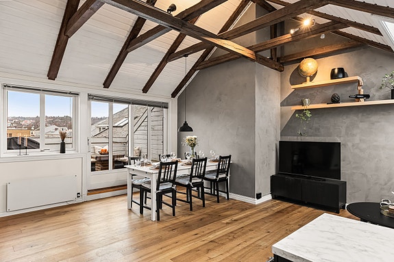 Her bor du supert til på toppen i denne vakre, gamle bygården - sentralt beliggende i Halden sentrum og kun et steinkast fra både Halden jernbanestasjon, bussholdeplass, samt byens restauranter og butikker. Leiligheten har en åpen og luftig planløsning med høyt til tak og vakre åpne takbjelker. Åpen løsning mellom stue og kjøkken. Leiligheten har nye enstavs eikeparkettgulv med gulvvarme! Stor, god skyveglassdør ut til den inntrukne verandaen. Her er det formiddagssol og utsikt til elven.