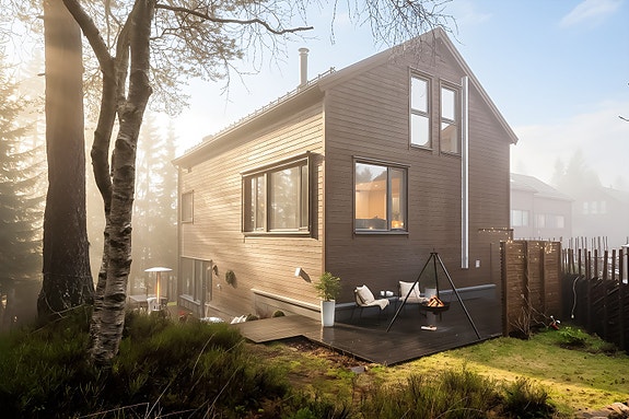 Moderne enebolig fra 2016 i naturskjønne omgivelser v/​marka - Solrike uteplasser - Dobbelgarasje - Praktikantdel - Peis