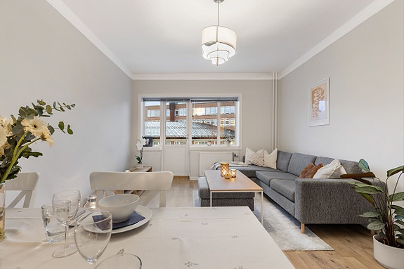 Lys og romslig 2-roms aksjeleilighet med balkong i sentrumsnært knutepunkt | Varmtvann, fyring og internett inkl.