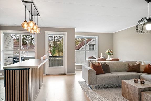 Denne flotte leiligheten over to plan byr på en perfekt kombinasjon av romslighet og praktisk beliggenhet. Hjemmet fremstår som innbydende og stilfullt med en trivelig atmosfære. To parkeringer.