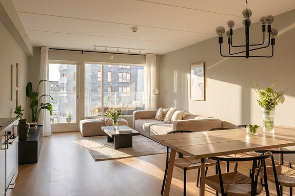 Her får dere et stilrent og innbydende hjem i et nyere bygg fra 2019. Leiligheten holder god standard og har en gjennomgående planløsning med naturlig soneinndeling. Rommene er luftige, og store vindusflater sørger for rikelig med naturlig lys. Når våren kommer, vil dere sette ekstra pris på en stor, solrik balkong vendt mot indre gårdsrom.