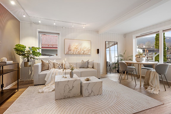 Boligen har et bruksareal på hele 73 kvm fordelt på en praktisk planløsning med lyse og innbydende rom. Store vindusflater i allrommet gir rikelig med naturlig lys og skaper en luftig atmosfære. Oppholdsrommet er romslig og har åpen løsning mot et moderne kjøkken med kjøkkenøy og rikelig med oppbevaringsplass. Soverommet er lyst og romslig, med stor skyvedørdsgarderobe. Stort og eldre baderom Boligen har også en praktisk bod med mange muligheter, i tillegg til en utvendig bod.