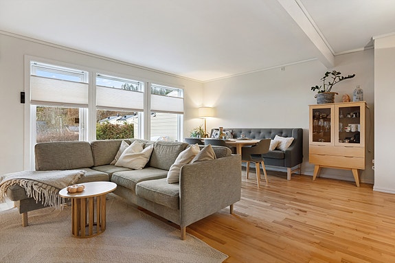 Planløsningen er særdeles god med 2 soverom, garderoberom (benyttet som soverom, men ikke omsøkt), nyoppusset kombinert bad og vaskerom fra 2025, romslig kjøkken, stor stue med pipeløp og varmepumpe, toalettrom og loft, samt både innvendig og utvendig bod. Fra stuen er det utgang til terrasse og hage med gode solforhold, og ved inngangspartiet finner du en hyggelig uteplass. Det er parkering for en bil i felles garasjerekke. Borettslaget har flotte fellesarealer med grillhytte og benker.