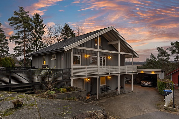 Eneboligen er fra 1985 og har et bruksareal på 213 m² fordelt over tre etasjer. Den har en romslig planløsning med loftstue, fire soverom, to bad, kjøkken, stue, hall med trapp, entré, vaskerom og bod. Uteplassen består av en stor veranda på 75 m² med tilgang fra stue og hage. Eiendommen inkluderer også en garasje på 17 m² og en carport. Tomten er på 702,6 m² og er opparbeidet med plen og diverse beplantning.