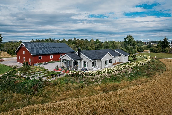 Heisann, Simen Smith Ringdal fra NORDVIK BOLIG her. Nå har jeg gleden av å presentere en eiendom man egentlig ikke vet at finnes. For dette er noe så sjeldent som et helt nytt småbruk. For 5 år gamle småbruk finner du knapt i Sandefjord og omegn. Og med på kjøpet får du en hage anlagt av en lidenskapelig gartner som har satt sammen disse uteområdene til en parkmessig hage der det spirer og gror gjennom de forskjellige deler av sesongen. Så får jordbæråkeren være den daglige luksusen.