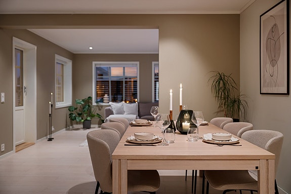 Gled deg til å oppleve delikate overflater, lekre innredninger i harmoniske farger og praktiske løsninger. En åpen og luftig planløsning gir en svært romslig følelse, og det merkes at alle kvadratmeterne er godt utnyttet. Varmepumpen i stuen sørger for en jevn og behagelig innetemperatur, sommer som vinter. For en ekstra lun og varm stemning er det bare å fyre opp i peisovnen.