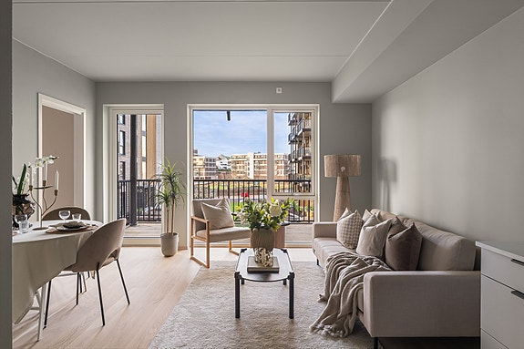 Hoveddel: Eikeparkett, lysmalte flater og listefrie overganger. Vannbåren gulvvarme. Innbydende entré. Stue-og kjøkken i åpen løsning med utgang til vestvendt balkong. Lekkert helfliset bad. 2 gode soverom