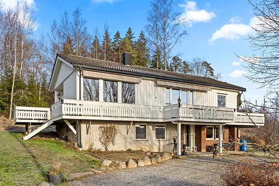 Landlig beliggende enebolig med garasje. Flotte uteområder og fin utsikt over åkrene. Eiendommen består av to tomter.