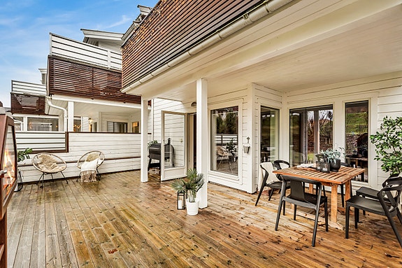 Tiltalende leilighet fra 2013 m/​flott, usjenert terrasse, 3 garasjeplasser og heis. Nær Vollen sentrum og sjøen