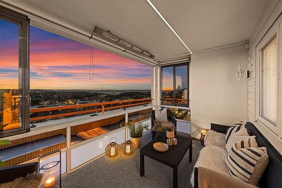 Boligen har en gjennomtenkt og familievennlig planløsning, romslige oppholdsarealer og en innglasset balkong som fungerer som en naturlig forlengelse av boligen.