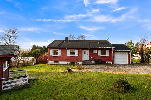 Familievennlig enebolig på stor hjørnetomt | Stor veranda på 43 m² | Garasje, lekestue og hage