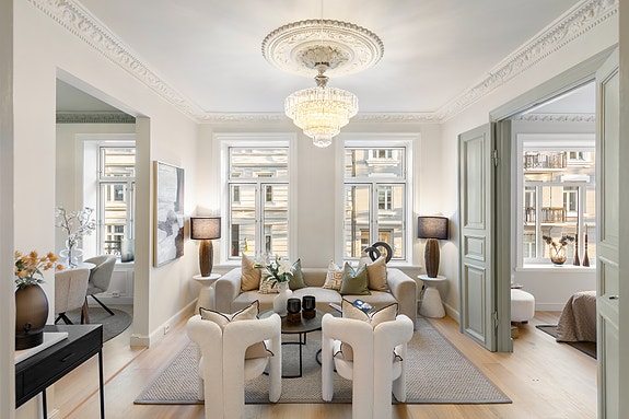 Vakker, nyoppusset 3-roms med balkong, rosett og stukkatur | Generøs takhøyde og store vindusflater | Rolig beliggenhet