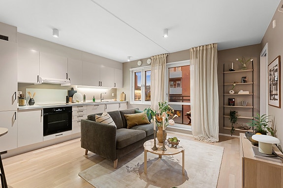 Leiligheten inneholder en lys og romslig stue med store vindusflater og gode møbleringsmuligheter. I åpen løsning er moderne kjøkken, og utgang til solrik balkong. Avslutningsvis lyst flislagt bad, stort soverom og innbydende entré med gode oppbevaringsløsninger.