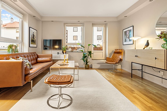 En moderne 2-roms leilighet med heis og balkong i 4. etasje. I tillegg er det tilgang til to takterrasser på 106 kvm, med utgang fra samme etasje som leiligheten.