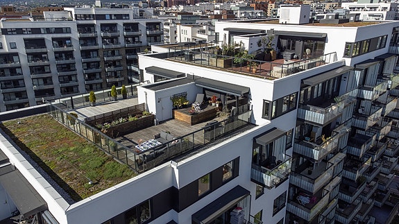 Spektakulær toppleilighet med takterrasse og balkong på hhv. 45 m² og 15 m². Magisk utsikt over Oslo. Garasje med lader.