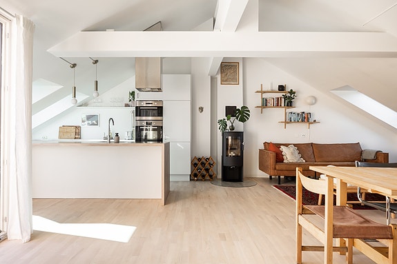 Unik loftsleilighet med gulvareal på hele 93 kvm med hybel, solrik usjenert takterrasse og takhøyde opptil 3,45m i stue.