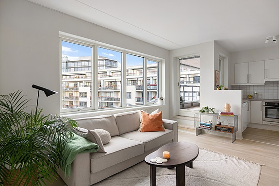 Lys og delikat 2-roms i 7. etasje med 8 kvm vestvendt balkong og utsikt! | Heis og garasjeplass | V.V. og fyring inkl.